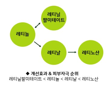 레티놀 화장품을 제대로 사용하기 위해 레티놀이 어떤 범위에서 제 역할을 발휘하는지 알아보겠습니다. 레티놀은 비타민 A에 속하며 체내에서 자체적으로 생성되지 않기 때문에 생리 활성도에 따라 각각의 다른 형태의 유도체로 존재합니다. 비타민 A에서 파생된 성분을 총칭하여 레티노이드라 부릅니다. 레티노이드는 알로콜 형태의 레티놀(C20H30O)과 팔미틱애씨드의 에스터 형태인 레티닐팔미테이트(C36H60O2), 알데히드 형태의 레티날(C20 H28 O), 산(Acid) 형태의 레티노산(C20H28O2)이 대표적입니다. 모든 형태의 레티노이드는 불안정한 구조를 지니고 있어 특정 효소 반응에 의한 전환 과정을 통해 레티노산 형태로 활성화될 때 비로소 피부에 흡수되어 제대로 된 역할을 할 수 있습니다. 이 레티노산은 여드름 피부 치료 기준으로 전문의 진단을 통해 처방받아야 하는 의약품이라, 효과는 우수하나 피부 자극이 심한 편입니다. 이러한 부분을 보완하여 개발한 성분이 레티놀, 레티날, 레티닐팔미테이트입니다. 불안정한 형태이지만 대사과정을 필수로 거쳐야 해서 피부에 가해지는 자극은 적지만, 활성 효과도 비례적으로 나타납니다. 현재는 레티놀을 안정화하여 함량을 높이거나, 레티날을 최종 형태인 레티노산으로 넘어가는 형태로 제품을 만들고자 하고 있습니다.