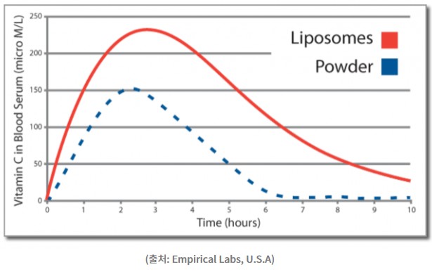 아래 그래프는 5g의 비타민C 분말과 리포좀 비타민C를 섭취했을 때 혈장 내 비타민C 농도를 측정한 것입니다. 리포좀 비타민C를 섭취하였을 때, 비타민 C 농도가 일반 비타민C 분말 대비 높은 점을 알 수 있습니다.