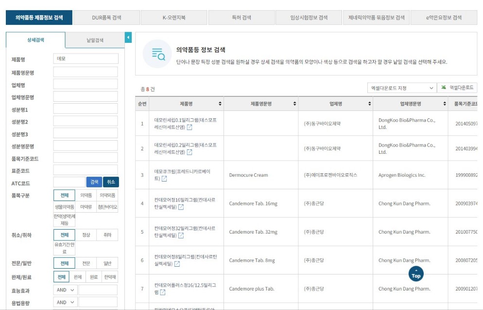 제품병, 업체, 성분, 품목기준코드, 표준코드, ATC코드 중 1개 이상 기입하여 검색 가능합니다.
