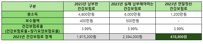 400만 원의 월급 기준으로 매월 건강보험료를 차감하였는데, 실제로 23년 연말정산 기준으로 총소득이 6,000만 원이 나왔습니다. 1년간 낸 건강보험료는 월 400만 원 기준 년으로 4,800만 원이었습니다. 이 기준으로 1,200만 원에 대한 건강보험료를 적게 냈다는 것을 확인할 수 있습니다. 23년에 급여에서 차감한 건강보험료와 실제 냈어야 하는 건강보험료 간 차액을 연말정산을 통해 환수하게 됩니다. 1,200만 원 X 2023년 건강보험요율(약 4%)에 해당하는 금액인 약 478,800원 정도를 환수하게 되다는 점을 확인할 수 있습니다.